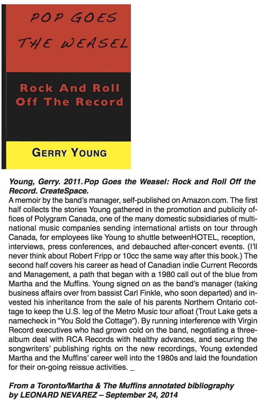 "Artist manager/record label head GERRY YOUNG has been a popular fixture on the Toronto music scene for three decades. He is best known for spearheading the careers of the internationally successful MARTHA AND THE MUFFINS and PARACHUTE CLUB, and as head of Current Records. He has just released a biography, the very amusingly entitled Pop Goes The Weasel: Rock And Roll Off The Record (“weasel” is a slang term for a record industry guy). The book is just as entertaining, and it concentrates on anecdotes from inside the business, rather than attempting to provide an overview of the period. As an executive at PolyGram Records back in the day when the major labels had way more money than sense, Young has plenty of stories to tell. Highlights include tales of early encounters with the likes of FRANCOIS TRUFFAUT, JERRY LEE LEWIS, BOB GELDOF and THE KINKS. A very easy read, this will appeal to those interested in the inner workings (and excesses) of the music business. The book is available from Amazon.com and other retailers." -- Kerry Doole, "On The Beat" -- Tandem Magazine, June, 2012
